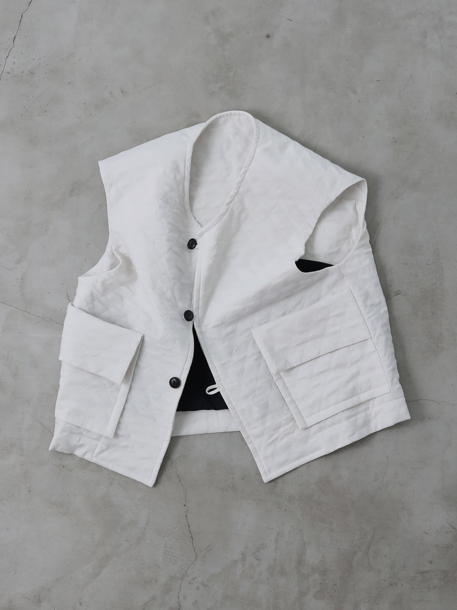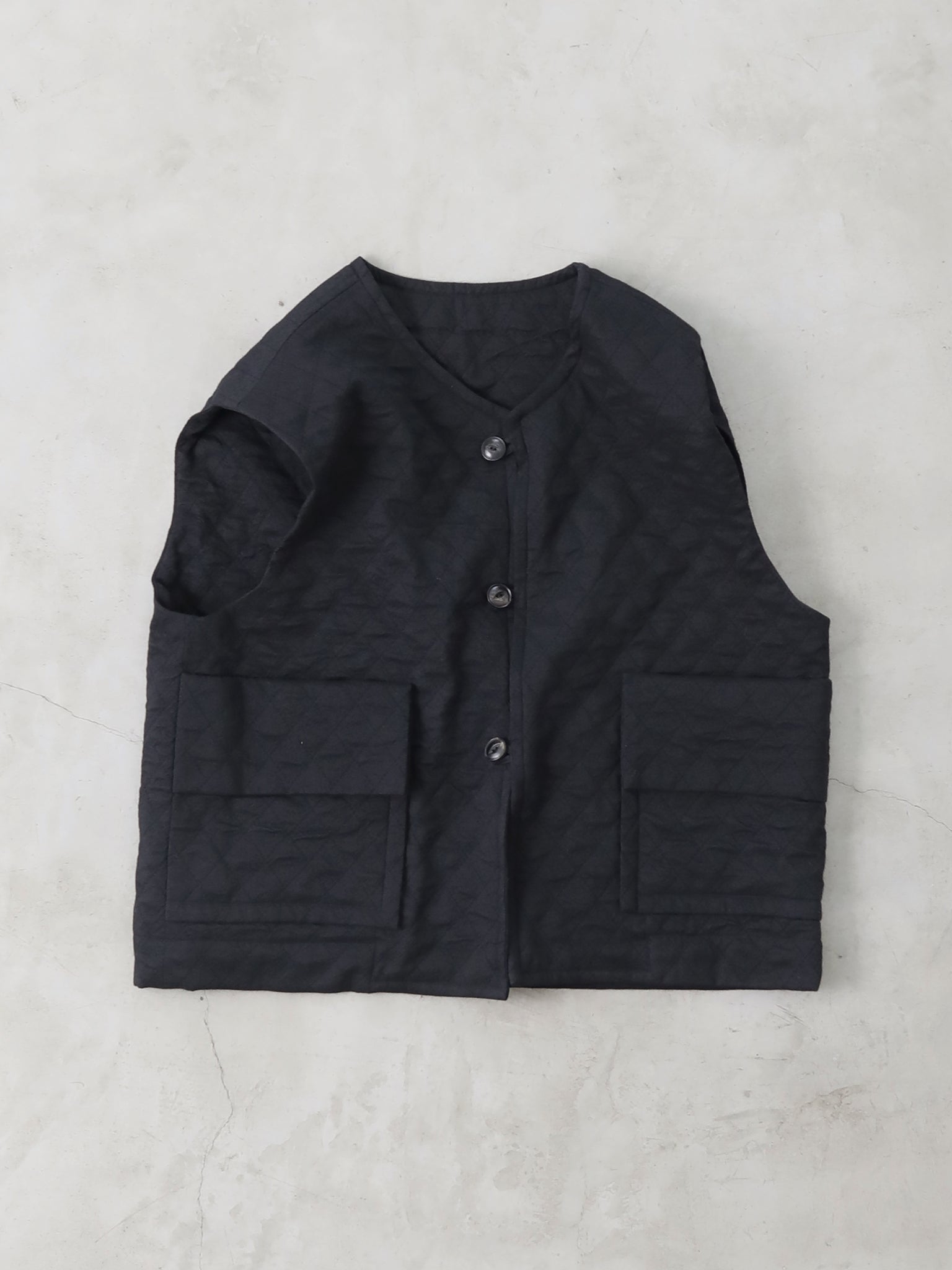 そこでジャカードの組織設計とコットンとウールの収縮差を利用し、生地そのものにダイヤカットの凹凸と膨らんだ空気層を形成、、、縫って作る代わりに織りでキルティング特有の外見と機能性を泥棒し、それでいて従来では得られないしなやかで軽やかな着心地を実現しました。