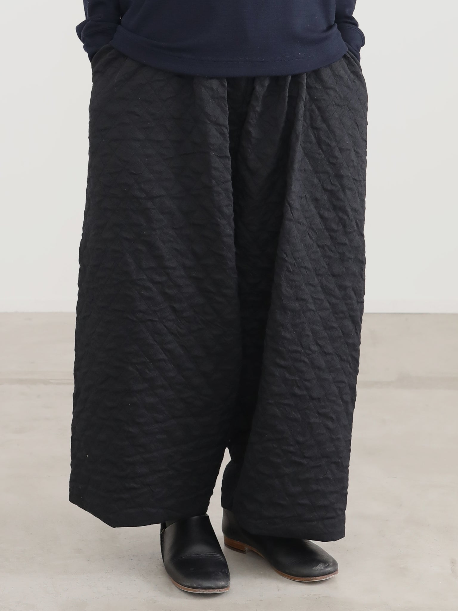 そこでジャカードの組織設計とコットンとウールの収縮差を利用し、生地そのものにダイヤカットの凹凸と膨らんだ空気層を形成、、、縫って作る代わりに織りでキルティング特有の外見と機能性を泥棒し、それでいて従来では得られないしなやかで軽やかな着心地を実現しました。