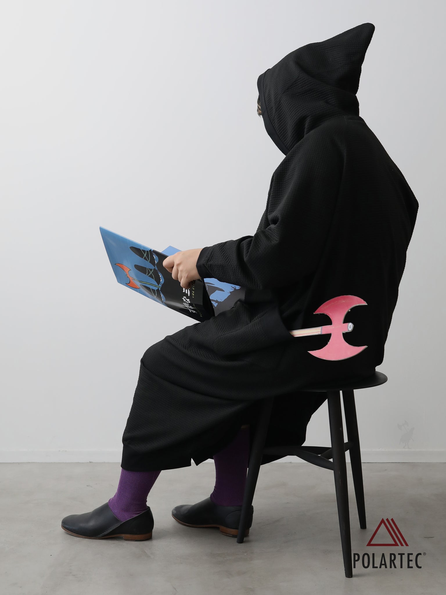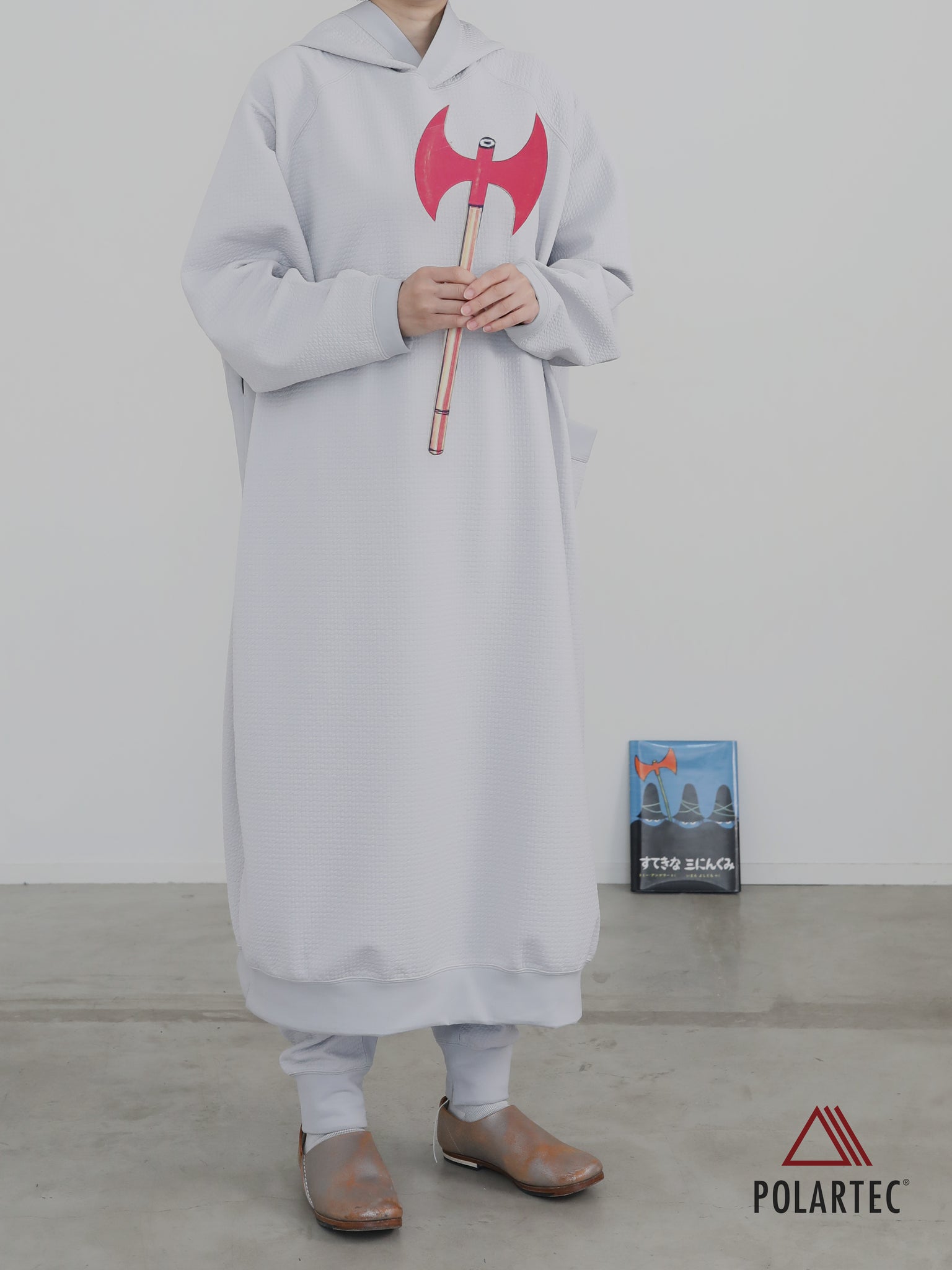 グニャっとした身頃は半丸同パターン、左脇下には大きめポケット、右脇下にはこもった空気を逃がすベンチレーションホールを配しました。左右でバランスが異なる袖も丈だけはジャストに帳尻を合わせてなんとかなんとか。尖ったフードに走るステッチは、絵本『すてきな三にんぐみ』からのインスピレーション。