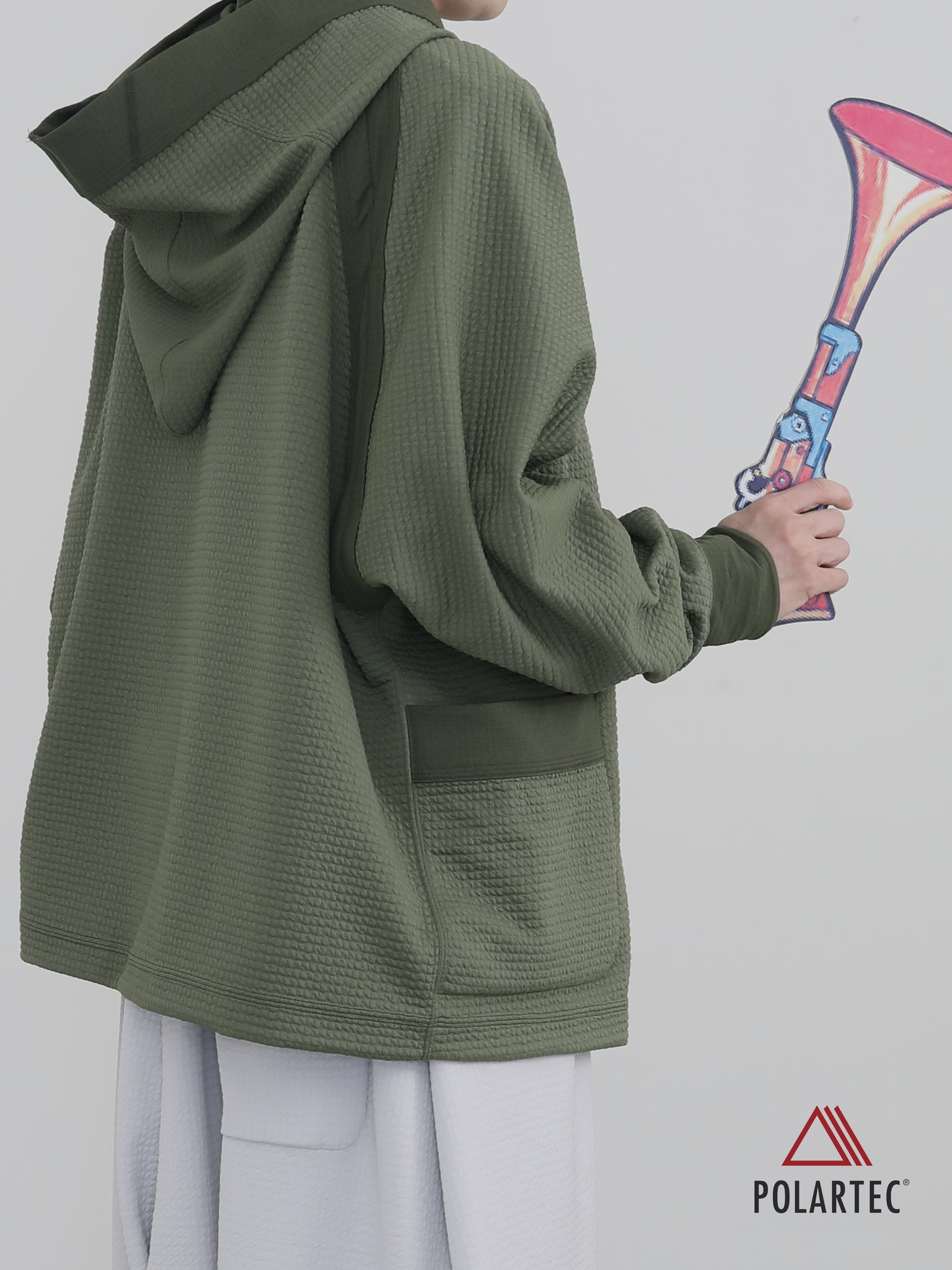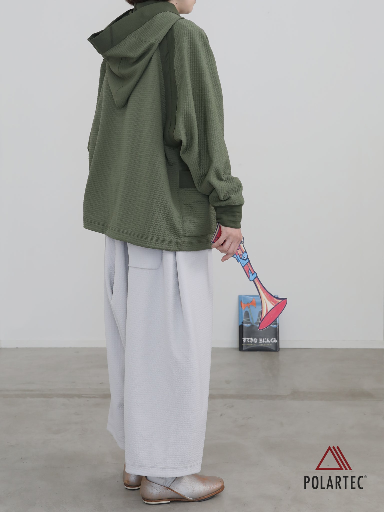 凸凹の可愛らしい表情に反して、秋から春まで頼れるパワーを秘めた POLARTEC® Power Air™。表裏でトーンが異なる生地の特徴を利用して“表使いしたり裏使いしたりしてみたり。