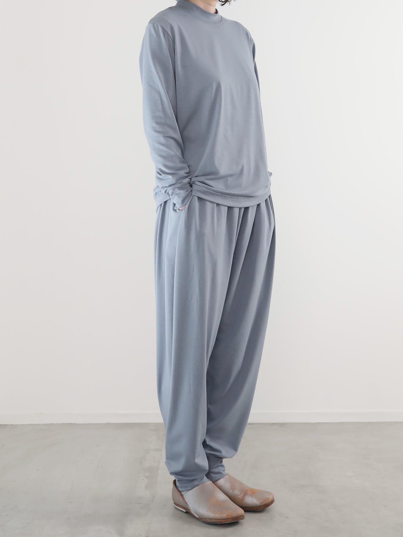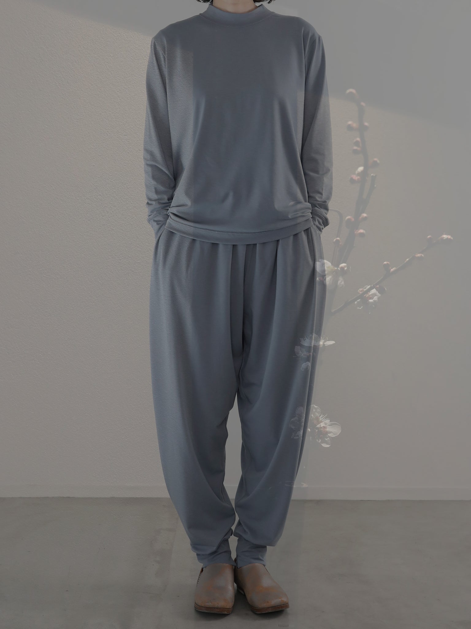 山の家やアトリエなど屋内で過ごす事が多くなった中で、リラックスを感じる素材を求める中で、、、本来はジョギングのスパッツやヨガなど、しなやかな動きを妨げないように開発されたであろうストレッチ性抜群の POLARTEC® Delta™ に注目。それをカタチとカッティングで屋内でも屋外でも楽しめる “お洒落くつろぎ着” に変換してみました。