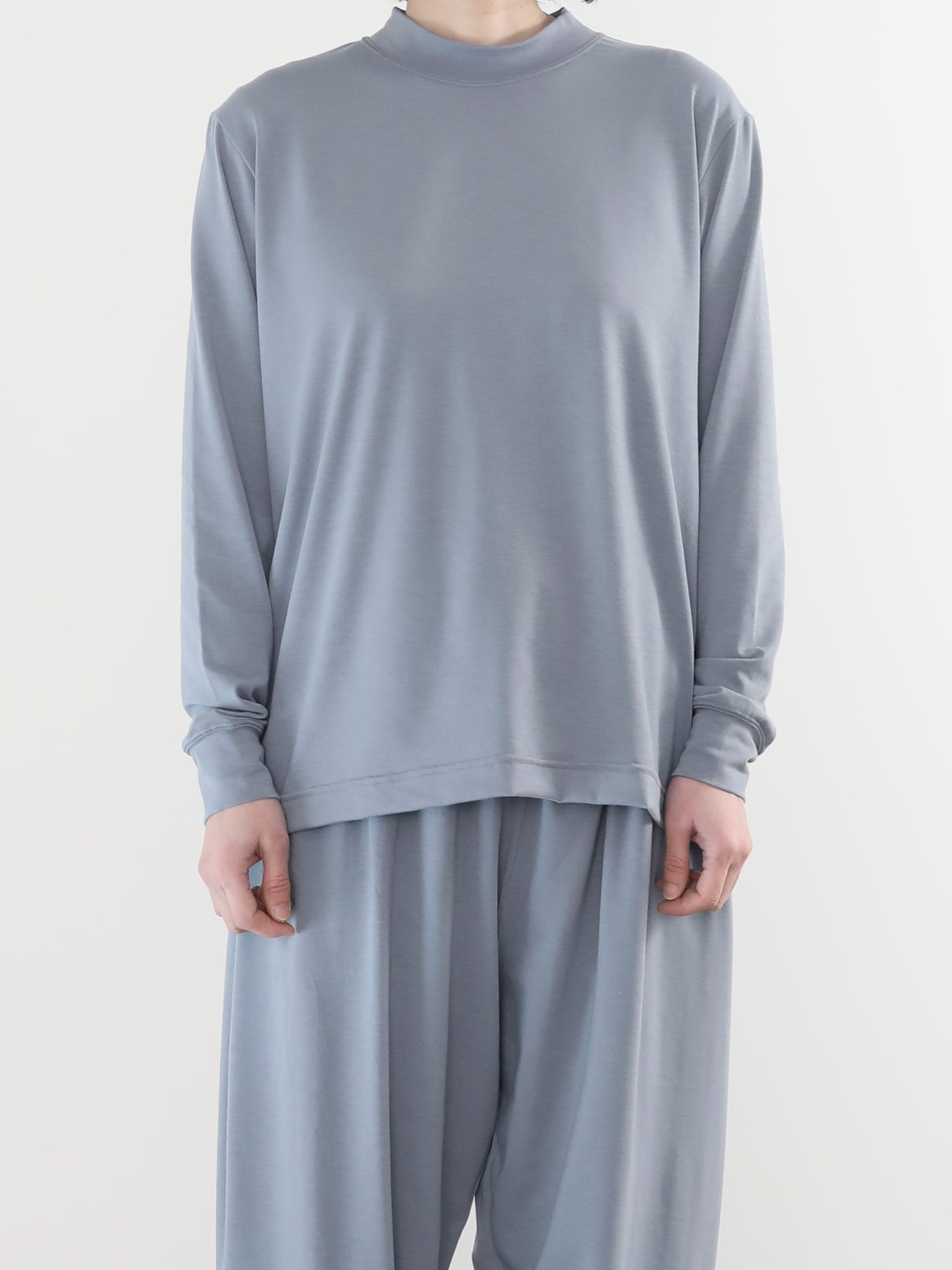 ほどよい感じにゆるーく首元を包み込む優しめモックネックカラーが特徴のハーフスリーブカットソー。 袖口はリブ始末で作業の時に捲り上げ可能。