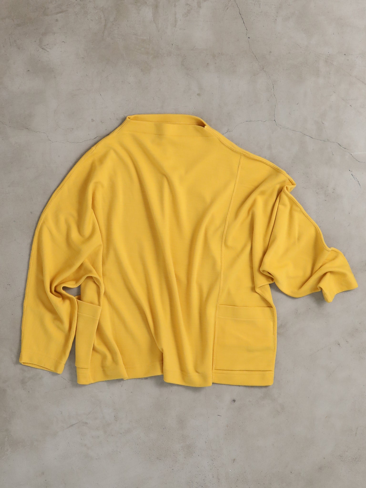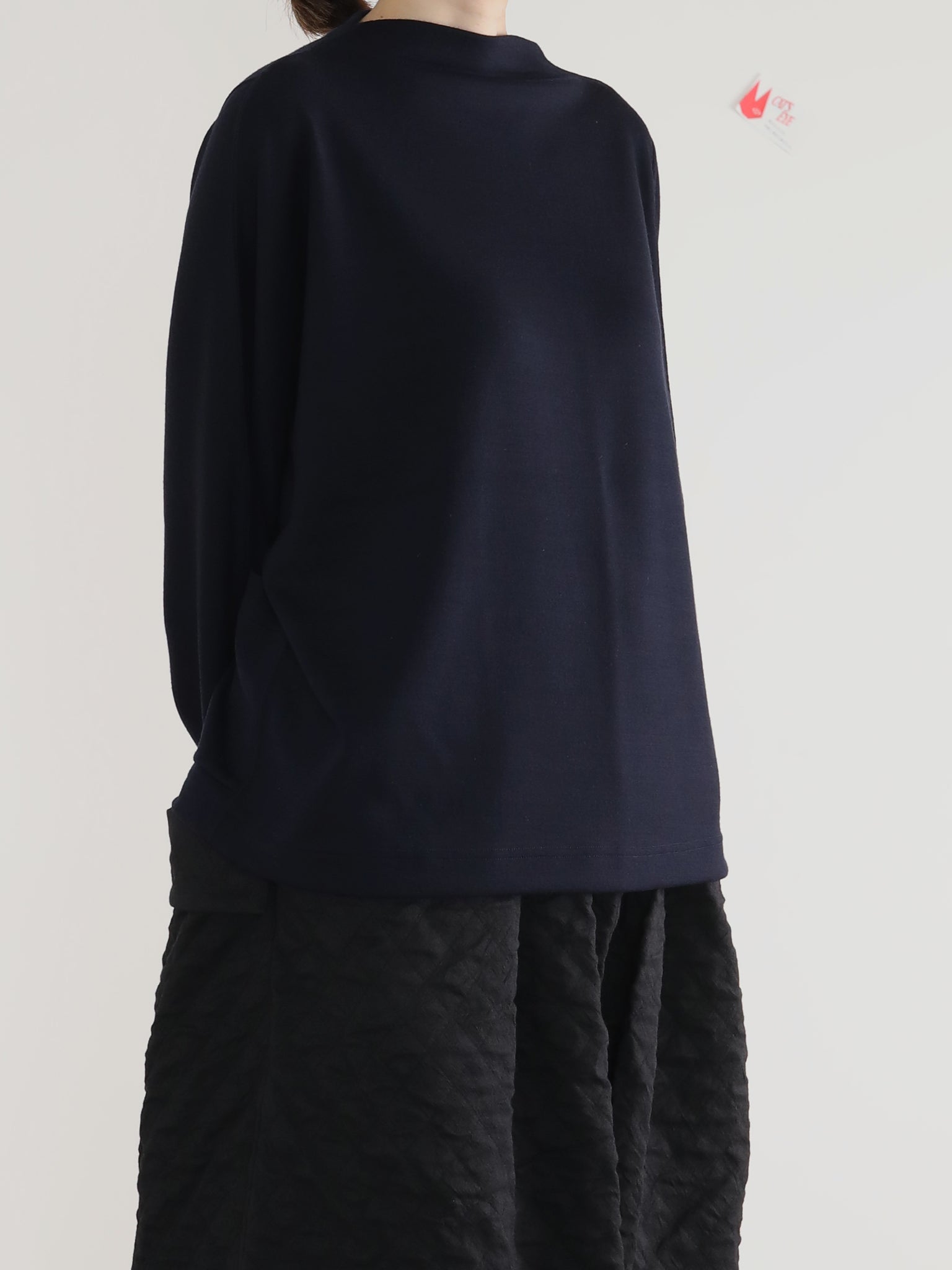 僅かに立ち上がり襟もとにボリュームを作るラムネックシリーズからセミワイドシルエットのドルマンスリーブ。